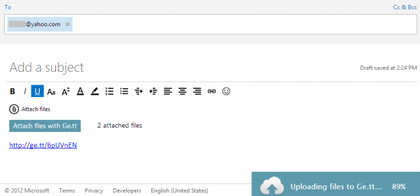 Có một cách khác không những có thể giúp bạn rút ngắn được thời gian chờ khi đính kèm tập tin vào Outlook.com mà với cách này bạn còn có thể đính kèm tập tin có dung lượng lên đến 2Gb đó là sử dụng Ge.tt.